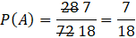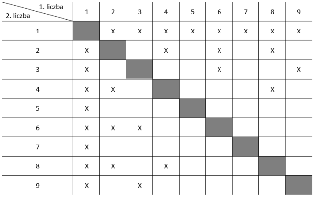 Zauważ, że cała tabela reprezentuje przestrzeń zdarzeń elementarnych, więc musisz policzyć, ile jest komórek w tabeli. Najszybciej to zrobisz przez pomnożenie ilości wierszy i komórek. Jest ich 9 ∙ 9, czyli 81. Musisz odjąć jeszcze szare komórki, których jest 8, więc przestrzeń zdarzeń elementarnych wynosi tutaj 81 – 9 = 72. Natomiast zdarzeniem losowym będą zaznaczone przez ciebie kombinacje liczb. Jest ich 28. Teraz korzystasz z klasycznej definicji prawdopodobieństwa.