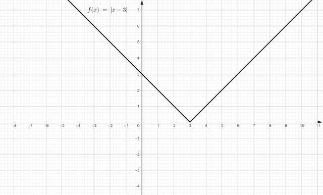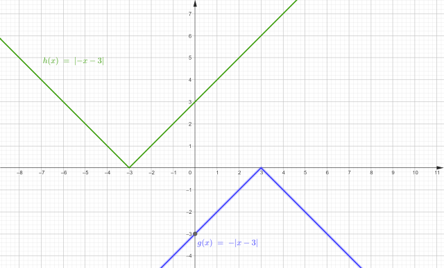 Funkcja f(x) = |x – 3| to przesunięta o 3 jednostki w prawo funkcja y = |x|. Aby utworzyć wykres funkcji g(x), wykres funkcji f(x) odbij symetrycznie względem osi OX, a żeby utworzyć wykres funkcji h(x), wykres funkcji f odbij symetrycznie względem osi OY.