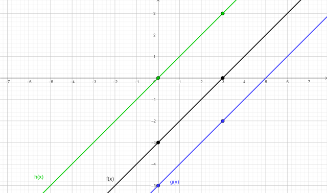 Narysuj wykres funkcji f: y = x – 3 oraz wykresu funkcji g(x) = f(x) – 2 oraz h(x) = g(x) + 5.