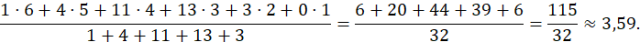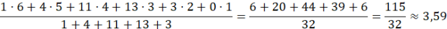 Tabela pokazuje, że klasa VIIa otrzymała następujące oceny: 1 ⋅ 6;4 ⋅ 5;11 ⋅ 4;13 ⋅ 3;3 ⋅ 2;0 ⋅ 1. Żeby policzyć średnią, należy zsumować wszystkie oceny i podzielić je przez liczbę uczniów: