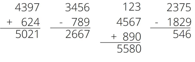 W podanych działaniach dopisz brakujące cyfry, pamiętając o zasadach dodawania i odejmowania pisemnego.
