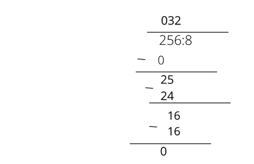 Zapisz liczbowo zapisane liczby, a następnie wykonaj dzielenie pisemne. Sprawdzamy, ile 8 mieści się w 2, ani jedna, a więc zapisujemy nad kreską 0 i mnożymy 0 razy 8. Wykonujemy odejmowanie. Zostaje nam liczba 2 i przepisujemy 5 zapisane powyżej, i teraz zastanawiamy się, ile 8 mieści się w 25. Robimy tak z każdą liczbą po kolei. Jeśli zrobimy tak, z wszystkimi liczbami a na dole pozostanie nam cyfra inna niż 0, to oznacza, że jest to reszta z dzielenia.