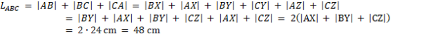 Okrąg wpisany w trójkąt ABC jest styczny do AB w punkcie X, do boku BC w punkcie Y i do boku CA w punkcie Z. Dodatkowo, wiadomo, że suma długości odcinków |AX| + |BY| + |CZ| wynosi 24 cm. Oblicz obwód trójkąta ABC.