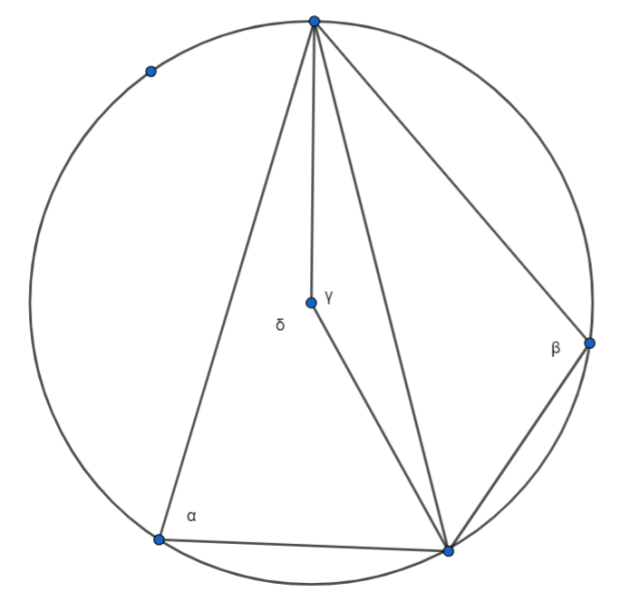 W tym zadaniu, patrząc na rysunek obok, uzasadnij, że suma miar kątów wpisanych α i β opartych na tej samej cięciwie jest równa 180°.