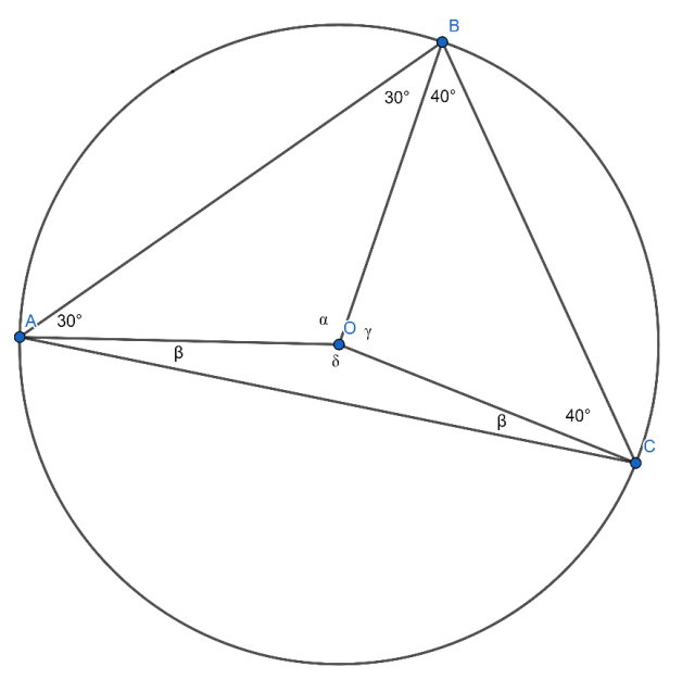 Przyjmij oznaczenia jak na rysunku. Zauważ, że w środku powstały 3 trójkąty równoramienne o ramionach r, dlatego kąty przy ich podstawach są takie same. Skorzystaj z własności, że suma kątów w trójkącie jest równa 180°. α, γ i δ tworzą kąt pełny 360°.