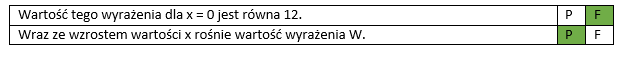 | Wraz ze wzrostem wartości x rośnie wartość wyrażenia W. | P | F |