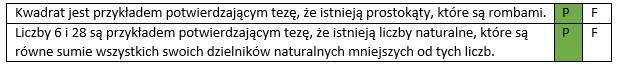 | Kwadrat jest przykładem potwierdzającym tezę, że istnieją prostokąty, które są rombami. | P | F |