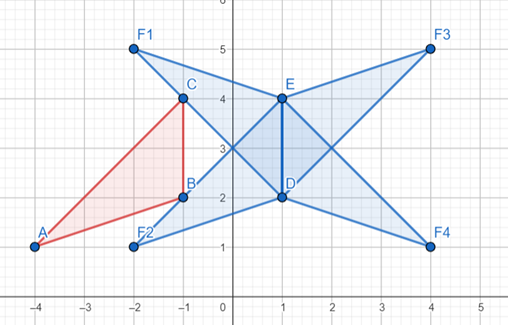 Znajdź takie punkty F, aby przy współrzędnych A=(-4,1), B=(-1,2), C=(-1,4), D=(1,2), E=(1,4) trójkąty ABC i DEF były przystające. Stwórz rysunek.