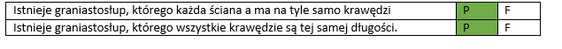 | Istnieje graniastosłup, którego wszystkie krawędzie są tej samej długości. | P | F |