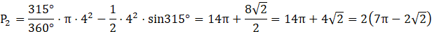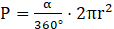 Prowadzimy promienie w kierunku punktów A i B, co implikuje powstanie trójkąta równoramiennego. Pole trójkąta można obliczyć jako połowę iloczynu długości sąsiednich boków i sinusa kąta zawartego między nimi. Wskutek poprowadzenia cięciwy, powstają dwie obszary, oprócz trójkąta AOB. Długość łuku o kącie środkowym