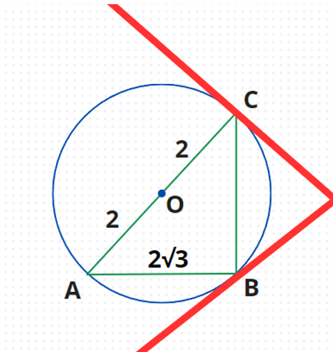 Dany jest okrąg o promieniu 2, którego średnicą jest odcinek AC. Policz kąt między cięciwą |AB| = 2 a styczną do okręgu w punkcie B oraz kąt między cięciwą BC a styczną w punkcie C.