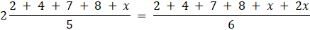 Średnia arytmetyczna zestawu 2, 4, 7, 8, x jest równa n a średnia zestawu 2, 4, 7, 8, x, 2x, wynosi 2n, więc: