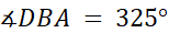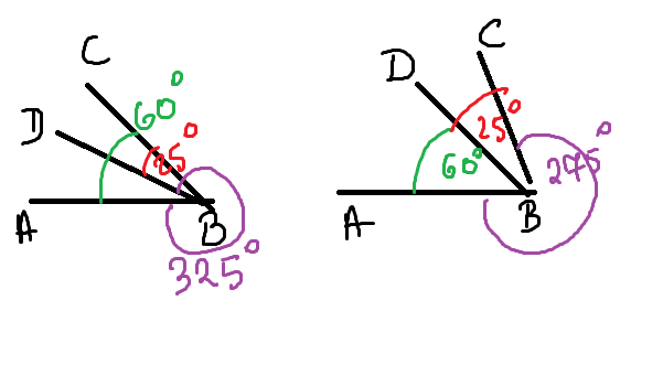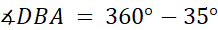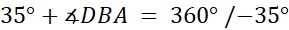 Kąt DBA oraz kąt DBC o mierze 25º tworzą razem kąt 60º. Z tego wynika, że kąt ostry DBA ma miarę 35º. Kąt wklęsły DBA i kąt ostry DBA o mierze 35º tworzą razem kąt pełny 360º.