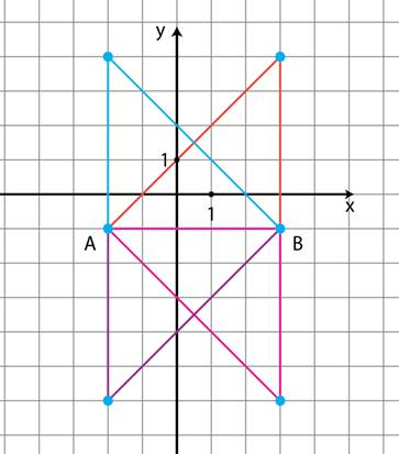 W tym zadaniu musisz znaleźć trzeci wierzchołek trójkąta prostokątnego równoramiennego, czyli trójkąta, w którym jedna para boków jest prostopadła i ma jednakową długość. Jedna przyprostokątna ma końce w punktach A=(-2,-1) i B=(3, -1). Musisz podać wszystkie cztery rozwiązania.