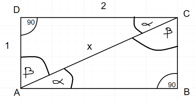 Wiedząc, że przekątna trójkąta o bokach długości 1dm i 2 dm dzieli prostokąt na dwa trójkąty musisz obliczyć wartości funkcji trygonometrycznych kątów ostrych tych trójkątów.