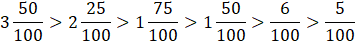 Najpierw rozszerz ułamki do mianownika 100, a następnie je porównaj. Aby porównać ułamki o takich samych mianownikach, najpierw trzeba porównać ich części całkowicie. Jeśli są one takie same, to większy jest ten, który ma większy licznik.