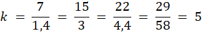Wyznacz skalę podobieństwa czworokąta C1 o bokach długości 7 cm, 22 cm, 15 cm, 29 cm do czworokąta C2 o bokach długości 1,4 cm, 4,4 cm, 3 cm, 5,8 cm.
