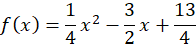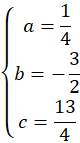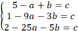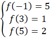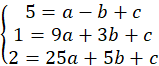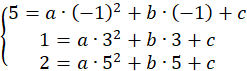 Stwórz układ trzech równań, podstawiając do wykresu kolejno punkty (-1, 5), (3, 1), (5, 2). Wyznacz wartości współczynników a, b i c i wzór funkcji.