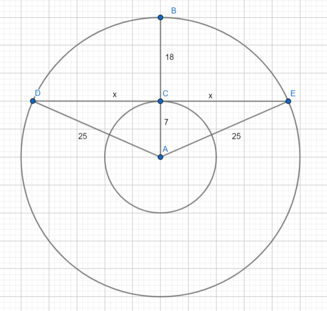 Narysowano dwa okręgi o promieniach 25 cm i 7 cm i o wspólnym środku. Oblicz długość cięciwy większego z okręgów stycznej do mniejszego z nich.