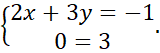 Spójrz na drugie równanie w układzie równań. Zauważ, że 0 nie jest równe 3, więc układ równań jest sprzeczny, czyli nie ma rozwiązań.