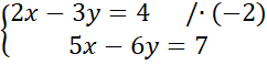 Równania podane w treści zadania zapisz za pomocą układu równań. Całe pierwsze równanie pomnóż przez (-2), aby współczynniki znajdujące się przy