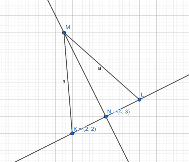 Wyznacz współrzędne punktu L w trójkącie równoramiennym KLM, w którym punkt K wynosi (2,2), punkt N = (4,3), |KM| = |LM|, odcinek MN to wysokość trójkąta.