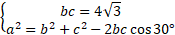 Wyznacz iloczyn bc ze wzoru na pole trójkąta i twierdzenia sinusów. Ułóż układ równań i skorzystaj z twierdzenia cosinusów, aby wyznaczyć wartość odcinka c.