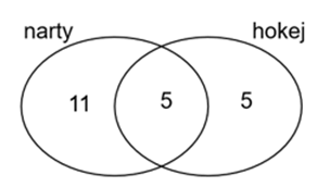 Ustal, ilu uczniów nie uprawia żadnego z wymienionych sportów, jeśli pewnej 30-osobowej klasie 16 uczniów jeździ na nartach, a 10 – gra w hokeja oraz połowa uczniów grających w hokeja jeździ na nartach