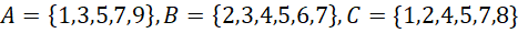 oznacza wszystkie elementy, które znajdują się jednocześnie w zbiorach A, B oraz C i na tej podstawie zapisz wszystkie elementy podanych zbiorów spełniające tą zależność.