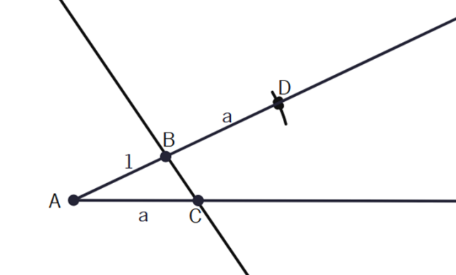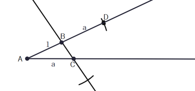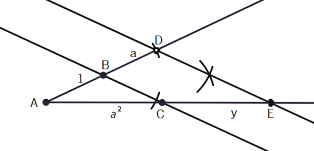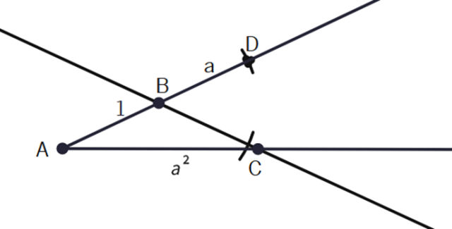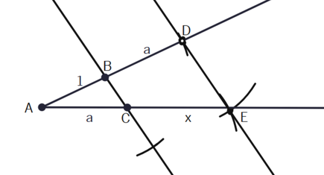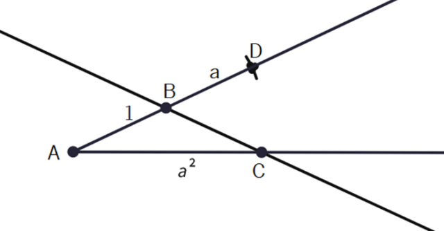 Następnie poprowadź prostą przechodzącą przez powstałe punkty i za pomocą cyrkla odmierz za odcinkiem długości 1 odcinek długości