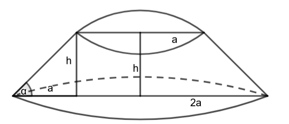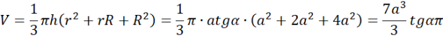 Na podstawie funkcji tangens wyznacz wysokość powstałej bryły, a następnie korzystaj ze wzoru na objętość stożka ściętego: