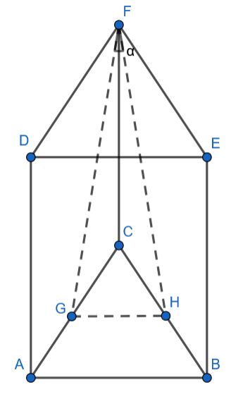 Skorzystaj z twierdzenia cosinusów, aby obliczyć długości odcinków GF i HF, a następnie z twierdzenia Pitagorasa wyznacz długość wysokość graniastosłupa oraz jego objętość i pole całkowite.