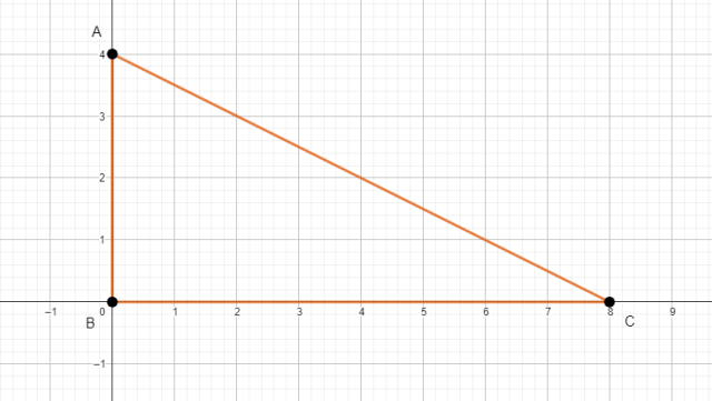 Stwórz rysunek pomocniczy. Wyznacz współrzędne punktów przecięcia z osią X i osią Y. Oblicz długość odcinków od początku układu współrzędnych do wyznaczonych punktów. Wykorzystaj wzór na pole trójkąta prostokątnego , dla przyprostokątnych a i b.