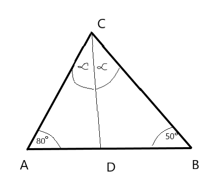 Najpierw obliczymy miarę kąta ACB. Wiemy, że suma miar kątów w trójkącie to 180o. Zatem miara kąta ACB to 180o – 80o – 50o = 50o. Dwusieczna dzieli kąt ACB na połowy. Czyli kąt alfa ma 50 o : 2 = 25o. Natomiast kąt DCB ma 180o – 25o – 50o = 105o.