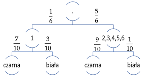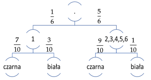 Niech P(A) oznacza prawdopodobieństwo wylosowania kuli białej. Możesz je zapisać jako drzewko prawdopodobieństwa. Zauważ, że pierwszym etapem jest rzut kostką. Każdy wynik możesz uzyskać z takim samym prawdopodobieństwem, więc prawdopodobieństwo wyrzucenia 1 wynosi