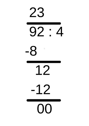 Należy podzielić liczbę wszystkich miejsc przez liczbę miejsc przy jednym stoliku, by obliczyć, ile takich stolików znajduje się w restauracji. Wykonując dzielenie pisemne, należy najpierw podzielić pierwszą cyfrę od lewej dzielnej przez dzielnik. Jeśli jednak dzielnik nie zmieściłby się w pierwszej cyfrze dzielnej od lewej, to należy wziąć pierwsze dwie cyfry dzielnej i wtedy podzielić je przez zielnik. Wynik z takiego dzielenia należy zapisać nad ostatnią cyfrą dzielnej, która była brana pod uwagę przy obliczeniach. Następnie zapisaną na górze w wyniku cyfrę należy pomnożyć przez dzielnik i zapisać pod liczbami, które dzielono wcześniej i wykonać odejmowanie. Wynik z odejmowania należy zapisać pod tymi liczbami i dopisać do niego kolejną cyfrę z dzielnej, jaka jest w kolejności i powtórzyć te same kroki co wcześniej podczas dzielenia. Dzielenie wykonuje się tak długo, aż nad cyfrą jedności dzielnej będzie w wyniku jakaś cyfra.