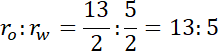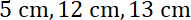 Trójkąt o bokach 5 cm, 12 cm, 13 cm jest trójkątem prostokątny. Dla trójkąta prostokątnego promień okręgu opisanego równa się połowie najdłuższego boku, promień okręgu wpisanego to połowa najkrótszego boku, czyli. W ten sposób udaje nam się obliczyć stosunek tych promieni, który wynosi 13 : 5.