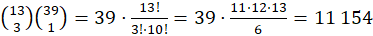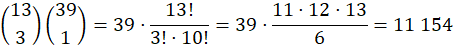 W talii kart jest 13 kart będących kierami i 39 kart nimi niebędących. Losujesz więc 3 karty spośród 13 oraz 1 kartę spośród 39, co daje