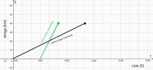 Dorysuj wykres drogi motocyklisty do wykresu i odczytaj w którym momencie wykresy dróg rowerzysty i motocyklisty przetną się.