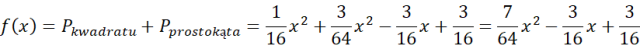 Zacznij od oznaczenia, że na budowę kwadratu przeznaczysz x m druta, a na budowę prostokąta 2 – x m druta. Oblicz długość boku kwadratu i następnie pole kwadratu. Podobnie musisz postąpić z prostokątem. Następnie zapisz wzór funkcji określającej sumę pól obu czworokątów. Funkcja przyjmuje wartość najmniejszą w wierzchołku, więc musisz wyznaczyć pierwszą współrzędną wierzchołka za pomocą wzoru: