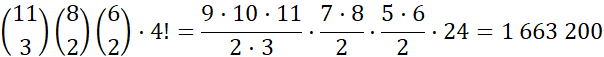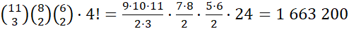 Masz do wykorzystania jedenaście liter, przy czym litera T występuje trzykrotnie, a O i A występują dwukrotnie. Tworzysz więc 11-elementowy ciąg liter. W pierwszej kolejności losujesz trzy miejsca z jedenastu dostępnych dla liter T. Następnie losujesz dwa miejsca z ośmiu pozostałych dla obu liter O. Kolejnym krokiem jest wylosowanie dwóch miejsc z pozostałych sześciu dla liter A. Resztę liter możesz rozmieścić na 4! sposobów. Łącznie możesz więc utworzyć