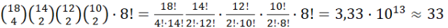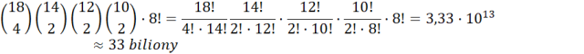 Masz do wykorzystania osiemnaście liter, przy czym litera O występuje czterokrotnie, a P, D i W występują dwukrotnie. Tworzysz więc 18-elementowy ciąg liter. W pierwszej kolejności losujesz cztery miejsca z osiemnastu dostępnych dla liter O. Następnie losujesz dwa miejsca z czternastu pozostałych dla obu liter P. Kolejnym krokiem jest wylosowanie dwóch miejsc z pozostałych dwunastu dla liter D oraz dwóch miejsc z pozostałych dziesięciu dla liter W. Resztę liter możesz rozmieścić na 8! sposobów. Łącznie możesz więc utworzyć