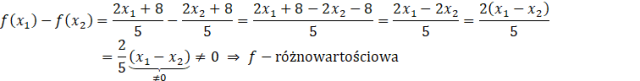 Aby udowodnić, że funkcja jest różnowartościowa, musisz pokazać, że dla dwóch różnych argumentów ich wartości także są równe, czyli musi zajść warunek: