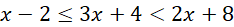 Oblicz zbiór rozwiązań podwójnej nierówności, a następnie przedstaw go w postaci przedziału oraz na osi liczbowej.