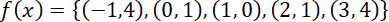Zbiór par uporządkowanych to zbiór par wyglądających w ten sposób: (x, y), gdzie x to argument, a y to f(x), czyli wartość funkcji dla argumentu x. Oblicz wartości funkcji f dla każdego argumentu z dziedziny i zapisz tą funkcję za pomocą zbioru par uporządkowanych.