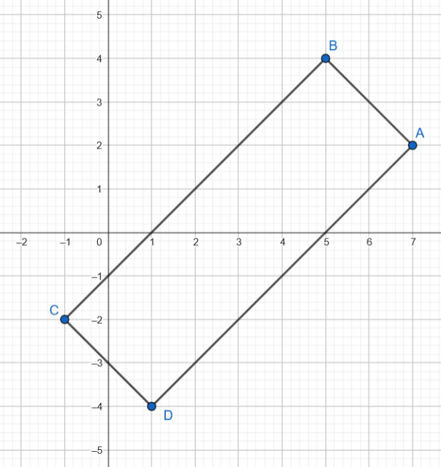 Zauważ, że podaną figurą jest prostokąt. Skorzystaj ze wzoru na długość odcinka: i na tej podstawie oblicz długości boków AB, BC, CD i DA oraz obwód wielokąta ABCD i jego pole.