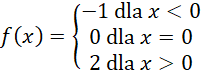 Dziedzina to zbiór liczb rzeczywistych, ale zbiór wartości to tylko 3 liczby. Najprostszym sposobem na rozwiązanie zadania będzie stworzenie wzoru funkcji w postaci układu trzech warunków: