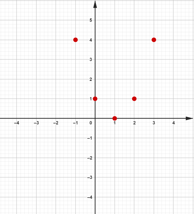 Sporządź schemat wykresu funkcji f, która liczbom ze zbioru {-1, 0, 1, 2, 3} przyporządkowuje kwadrat tej liczby pomniejszonej o 1, wynosi 4.