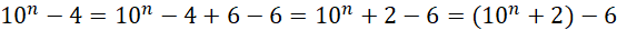 Dla dowolnej wartości n∈ N+liczba 10n+2 będzie miała postać 100…..0002. Oznacza to, że suma ich cyfr wynosi 3, a więc i cała liczba 10n –4 jest podzielna przez 3.