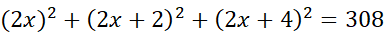 Trzy kolejne liczby parzyste to 2x, 2x + 2 i 2x + 4. Przyrównaj sumę ich kwadratów do 308 i wyznacz wartość x. Na koniec wyznacz dwa zestawy trzech liczb spełniających warunki zadania.